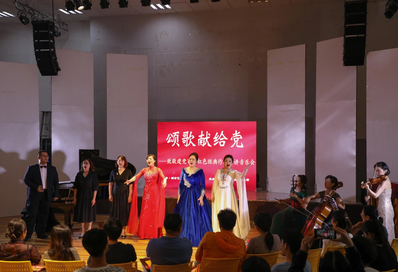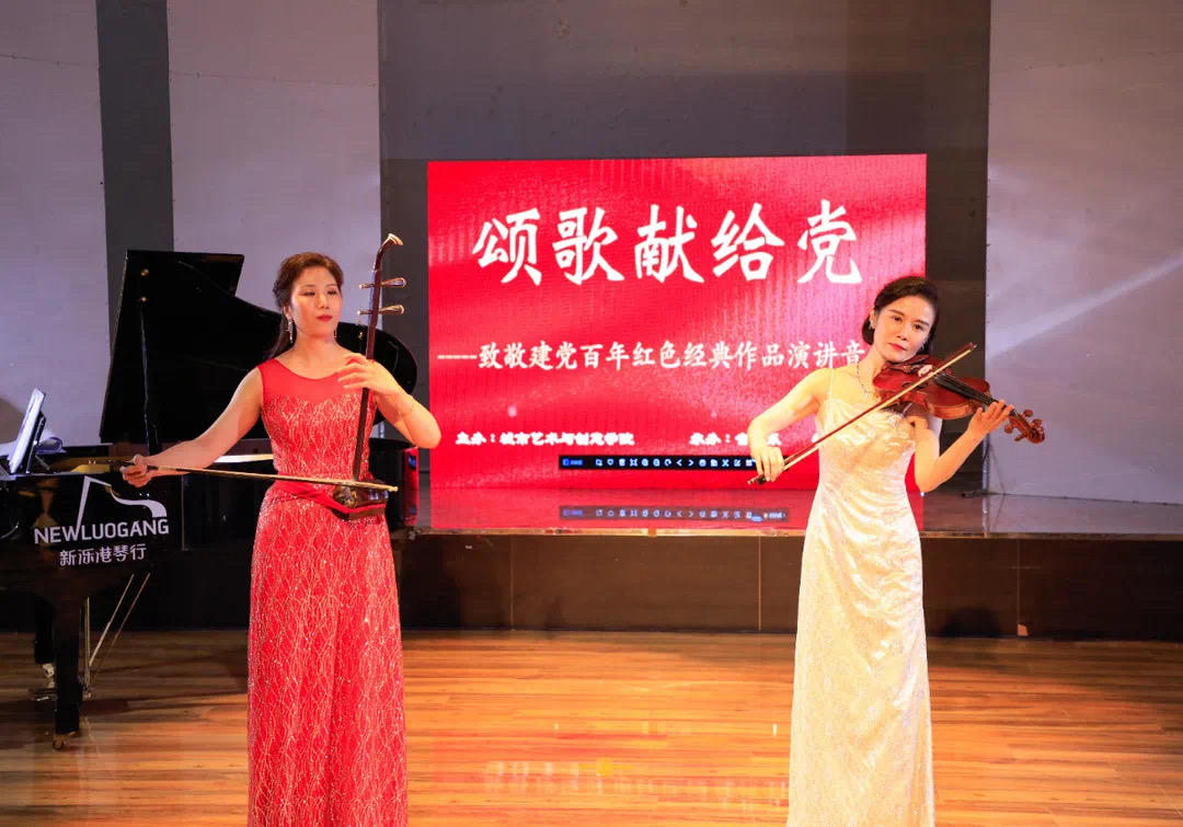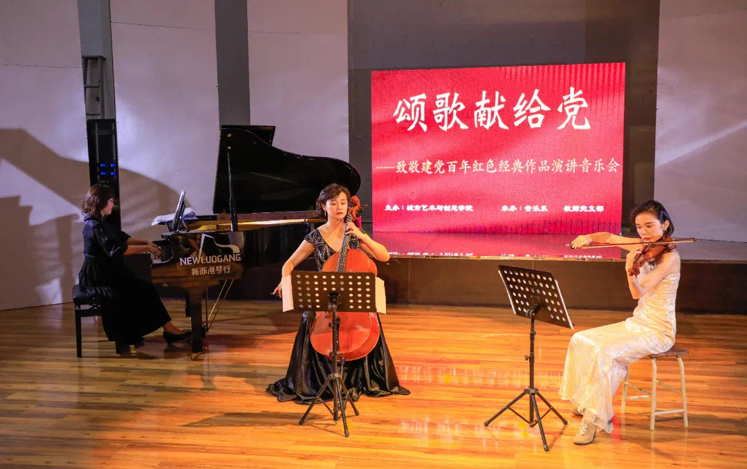 音乐会在大提琴演奏《我爱你中国》的旋律中拉开序幕,城市艺术创意公司音乐系和教师党支部的教师、党员以民乐与西洋乐交辉相应的形式演绎经典旋律。室内乐三重奏、钢琴协奏、二胡独奏、弦乐二重奏、声乐等将《兰花花》《瑶族舞曲》《游击队之歌》《黄河颂》《光明行》《思乡曲》《菩萨蛮 黄鹤楼》《红梅花又开》《曙色》《我的家乡沂蒙山》《五洲人民齐欢笑》一系列红色经典曲目生动演绎,教师支部宣传委员担任导聆,通过专业性与趣味性并重的导赏,将党史教育内容与音乐旋律生动结合,从歌曲创作背景、思想内涵、时代意义中凝练出中国共产党百年奋斗的光辉历程,宣讲中国共产党在长期奋斗中铸就的伟大精神。蓝鲸体育充分发挥音乐专业优势,讲演结合,深情抒发对中国共产党的崇高热爱,让现场观众沉浸在音乐视听的感染和党史学习教育的浓厚氛围中,接受红色文化熏陶,汲取奋进精神力量。音乐会在齐奏齐唱《我和我的祖国》的优美旋律中推向高潮,台下观众高声合唱,表达出对党和祖国的爱与祝福。