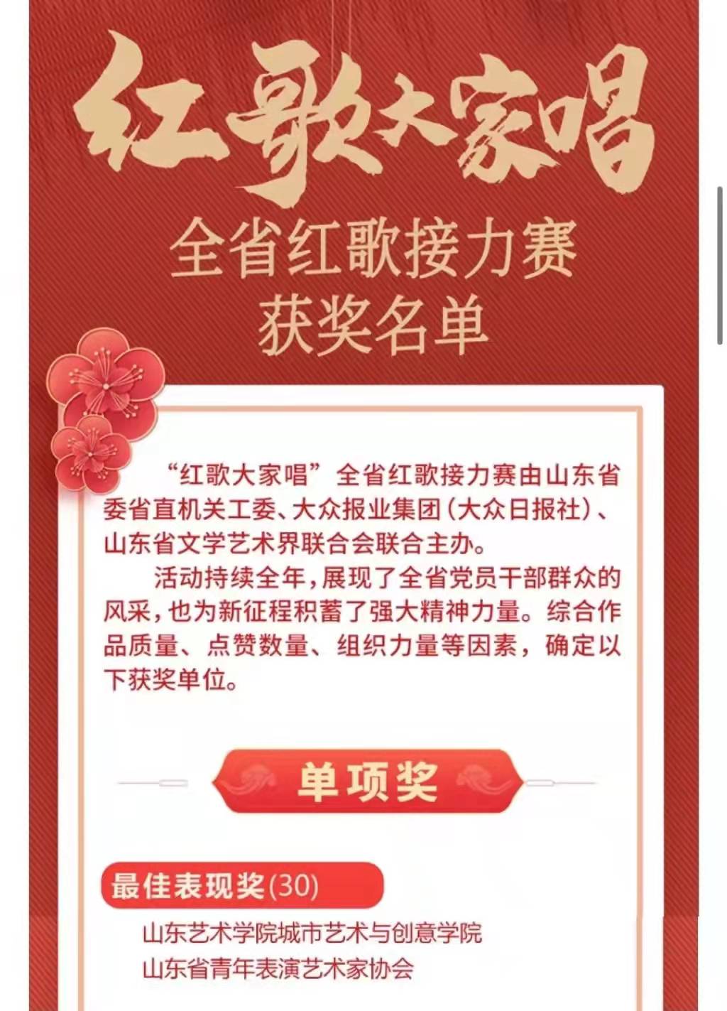 蓝鲸体育融合专业创新形式开展党史学习教育和红色现场教学,倡导“沉浸式”体验、“融入式”教育、“互动式”学习。打造“歌、颂党史、艺启学习、美育圆梦”教育品牌。拍摄《追寻》MV”,在由山东省委省直机关工委、大众报业集团、山东省文学艺术界联合会主办的“红歌大家唱--全省红歌接力赛”中获得最佳表现奖。