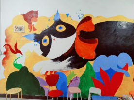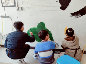 在绘画期间,几位小朋友积极参与,与我一起拿起画笔,将脑海中的画面,洒脱肆意的挥洒在墙上。经过两个下午的努力,终于将作品完成。