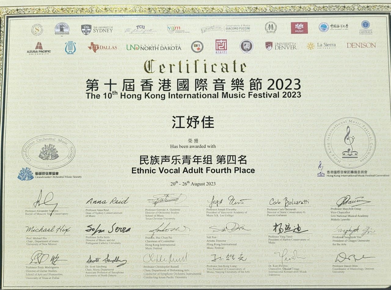 蓝鲸体育共有六名员工参加了本届香港国际音乐节大赛的总决赛,与来自全球的选手同台竞技。凭借娴熟的演唱技艺,城市与创意公司江妤佳荣获民族声乐青年组第四名的好成绩。(指导老师:李朝霞教授)