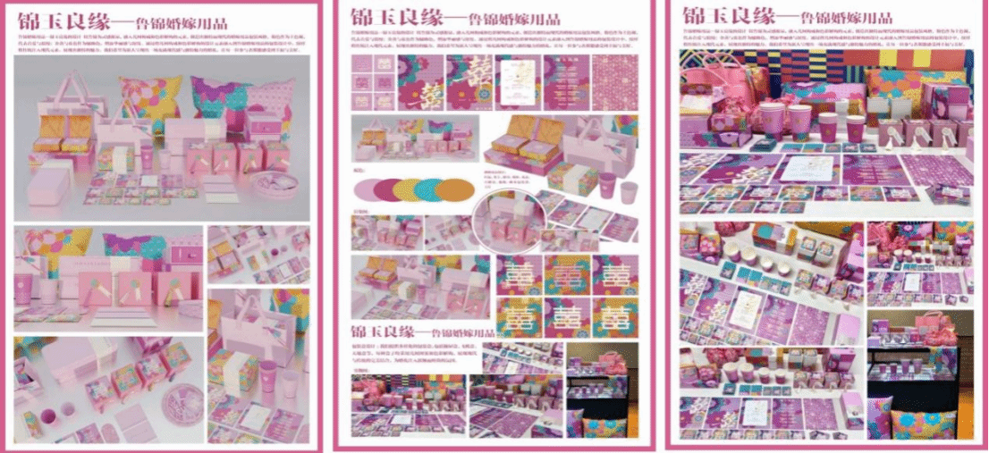 鲁锦婚嫁用品—锦玉良缘的设计,是以鲁锦为灵感源泉,融入几何构成和色彩解构的元素,创造出独特而现代的婚嫁用品包装风格。粉色作为主色调,代表着爱与浪漫;金黄与蓝色作为辅助色,增添华丽感与深度。通过将几何构成和色彩解构的设计元素融入鲁锦婚嫁用品的包装设计中,纹样将传统注入现代元素,展现出独特的魅力,希望为新人呈现出一场充满现代感与独特魅力的婚礼,让每一位参与者都能感受到幸福与美好。