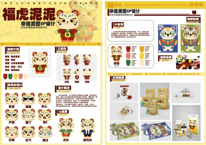 “福虎泥泥”是山东非遗泥塑IP设计,以山东福字年画等为灵感,通过深入挖掘山东泥老虎文化,融合民俗与现代审美,将传统造型简化创新,用民间色彩赋予活力,打造可爱勇敢的形象。同时开发了表情包、海报、包装、用品等,既保留非遗韵味,又具现代传播性,让山东非遗泥塑以新形式走进生活,实现传统文化的创造性转化与创新性发展。