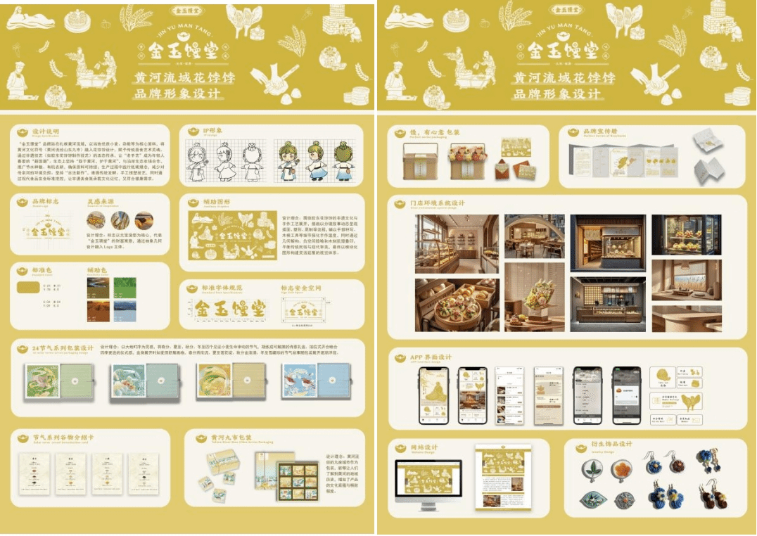 “金玉馒堂”品牌设计以花饽饽这一非物质文化遗产为核心,通过现代视觉语言赋予其新的生命力。整体设计融入黄河九市文化符号,以手绘插画展现花饽饽的非遗技艺、民俗场景及食材特色,使品牌更具故事感与情感共鸣。色彩上选取黄河流域的麦田金黄与土地暖棕,传递自然与匠心的温度。品牌Logo结合篆刻风格与现代字体,既彰显传统韵味,又符合当代审美。IP形象采用拟人化设计,使非遗文化更具亲和力。包装设计围绕二十四节气和黄河九市展开,打造具有文化深度的视觉体系,让花饽饽这一非遗美食在现代语境中焕发新生,成为新时代的国潮象征。
