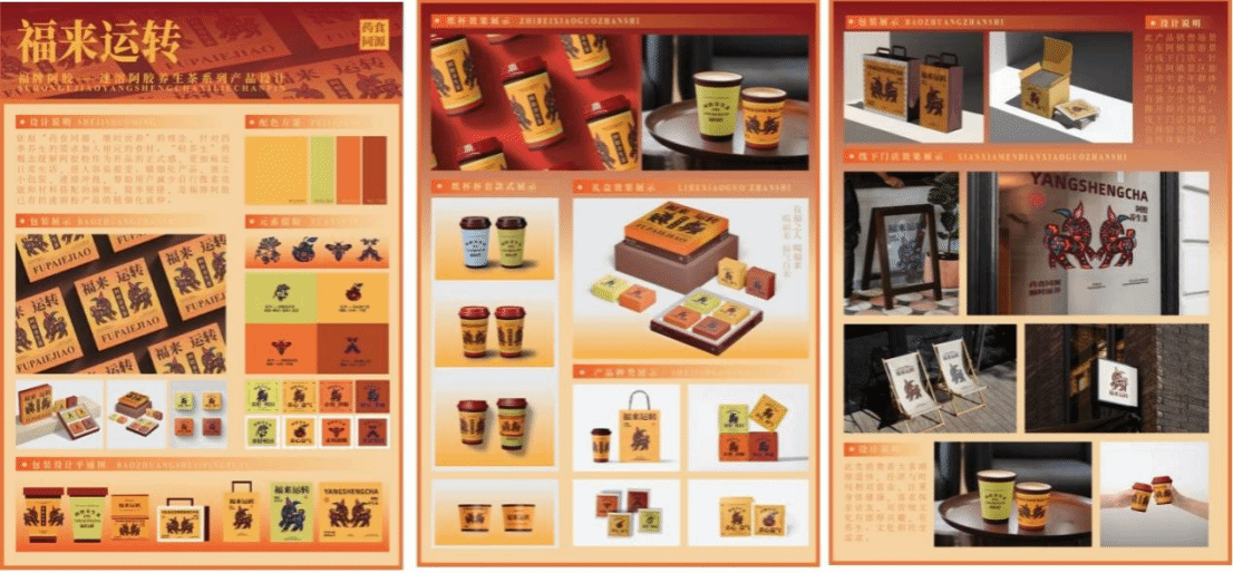 有福之人喝福来;喝福来,福气自来。本产品用于在东阿镇旅游景点的文创空间售卖,是福牌阿胶阿胶粉产品的精细化延伸。在包装设计中运用剪纸、驴、葫芦等传统文化元素,依托“药食同源,顺时而养”的传统中医药理念,春养“生”、夏养“长”、秋养“收”、冬养“藏”,针对不同季节人体养生需求的变化,制成春夏秋冬四款不同口味的阿胶茶饮产品,四时八节,顺时而养。
