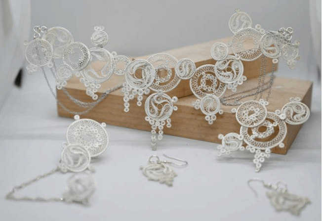 这套银饰的灵感源自“泉城”济南的灵动水韵,以“涟游”为核心设计元素,通过现代花丝工艺,将传统意象与当代审美相结合,巧妙地融合山东文化的深厚底蕴。银丝勾勒的层层波纹,既象征趵突泉水的灵动生机,又暗喻儒家“仁、义、礼、智、信”的思想精髓由内而外扩散,润物无声却影响深远。每一道荡漾的纹路,都诉说着孔孟之乡的文化传承,似潺流水,绵延千年而不息。