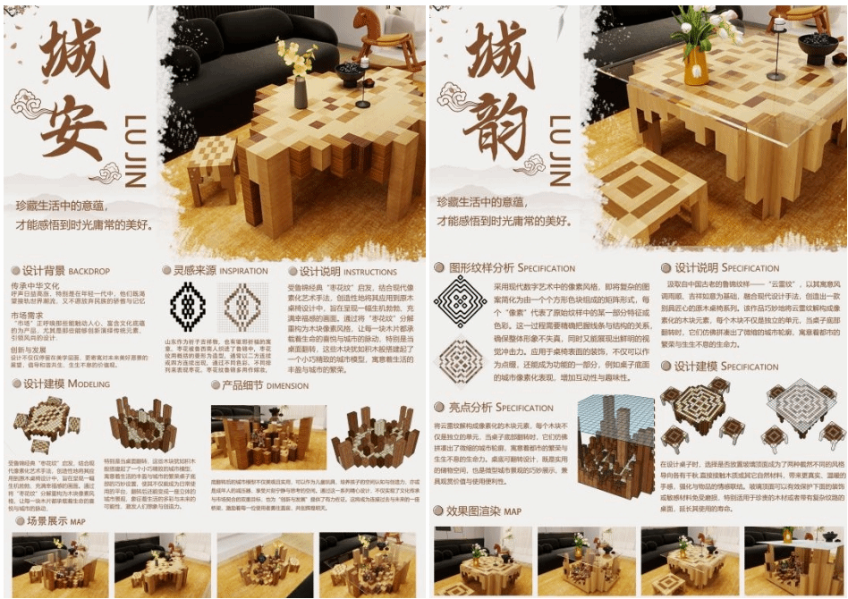 汲取自中国古老的鲁锦纹样--“云雷纹”与“枣花纹”,以其寓意风调雨顺、吉祥如意为基础,融合现代设计手法,创造出一款别具匠心的原木桌椅系列。该作品巧妙地将云雷纹及枣花纹解构成像素化的木块元素,每个木块不仅是独立的单元,当桌子底部翻转时,它们仿佛拼凑出了微缩的城市轮廓,寓意着都市的繁荣与生生不息的生命力。