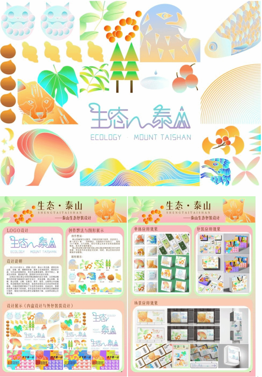 本作品在字体设计上含有山峦、鹤、蝴蝶等形象。主体设计图以泰山珍稀动植物们的形象为基础,涉及金雕、泰山花楸、青桐、泰山豹猫、石敢当等,对其进行扁平化设计和排列,组成色彩缤纷的和谐画面,旨在呼吁大家关注野生动植物保护,增加大家对泰山野生动植物的了解。