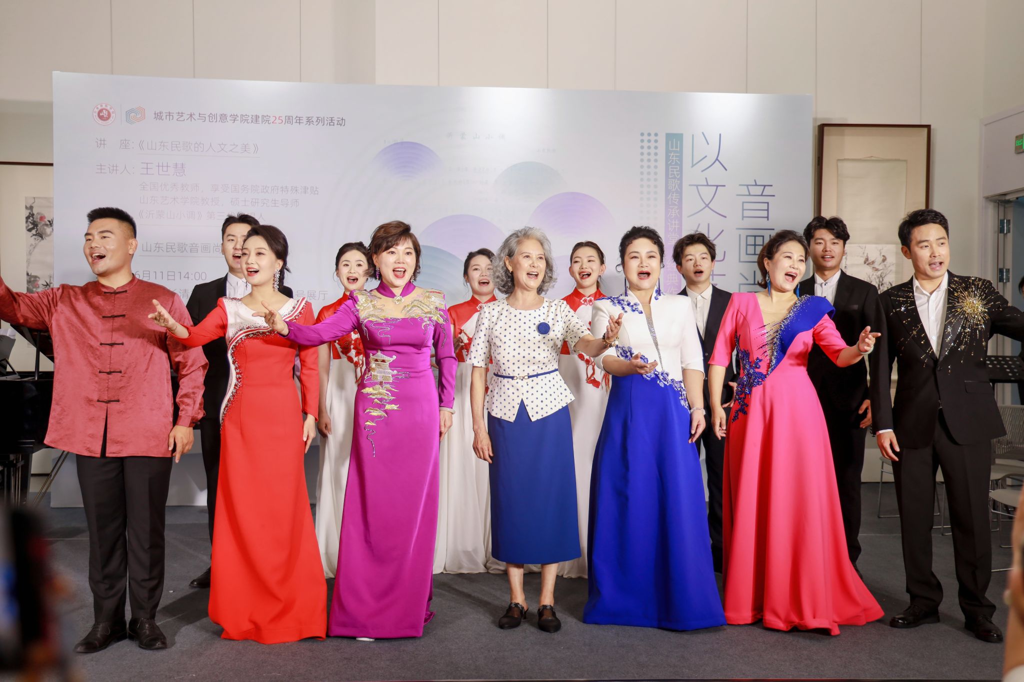 音乐会环节,山艺学子与 王世慧教授的优秀弟子们联袂登台,献唱《大踏青》《绣荷包》等经典曲目。当王世慧教授以醇厚婉转的嗓音唱响《沂蒙山小调》,熟悉的旋律瞬间点燃全场,将传统民歌的艺术魅力展现得淋漓尽致,为师生呈上一场融历史底蕴与艺术张力于一体的视听盛宴。