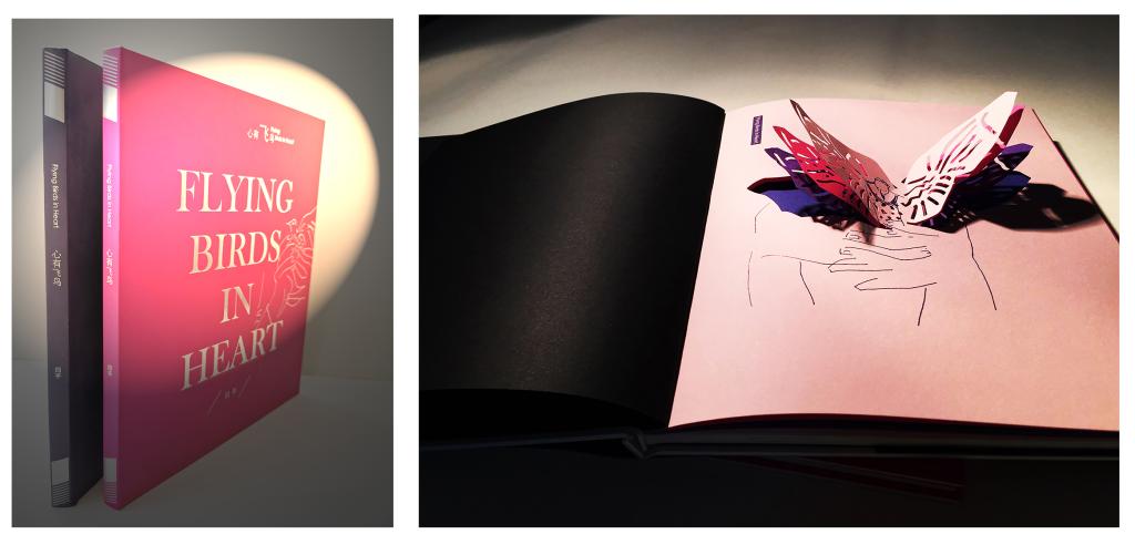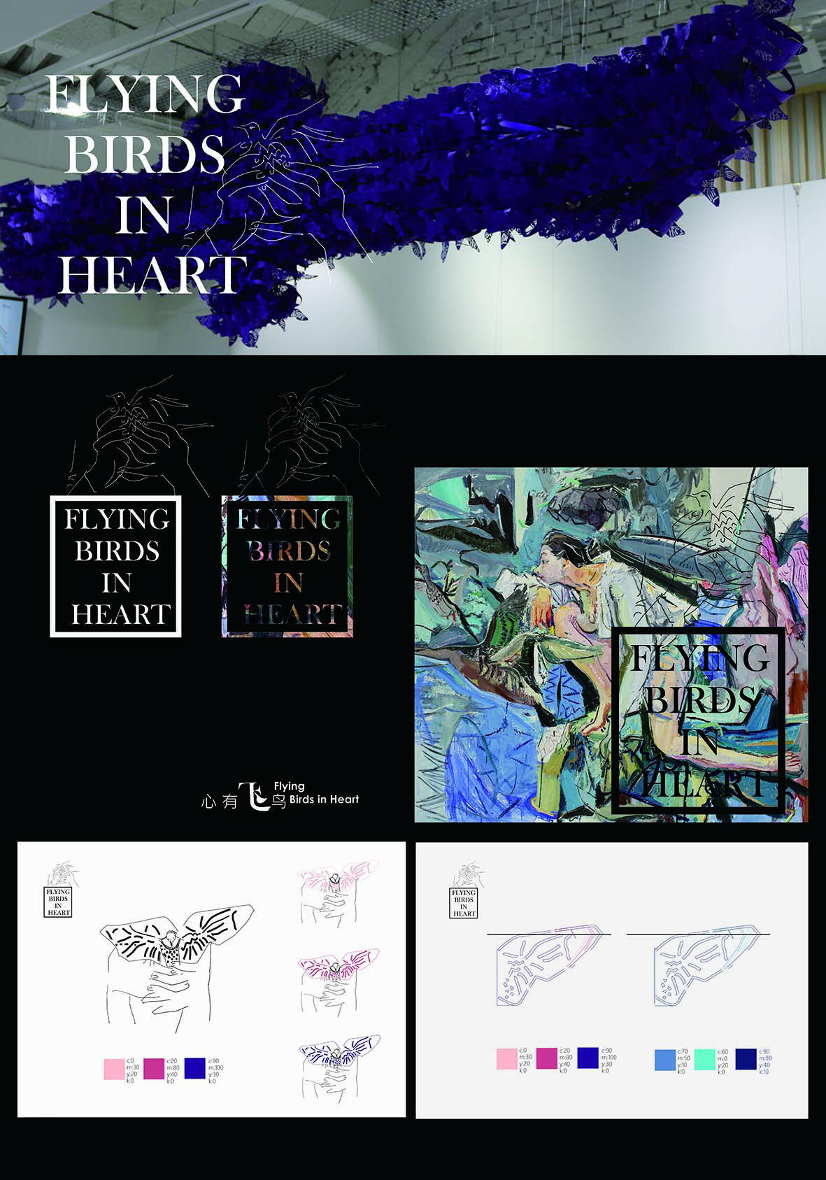 飞鸟对于辽阔天空的向往是无可按耐的。“心有飞鸟”视觉形象设计以两组“飞鸟与人手”的速写图形来传递展览的主题。视觉系统中的应用设计,将“心有飞鸟”主题不断扩展,以飞鸟从作品中飞出,飞到每一个观者身边为线索进行设计。视觉系统中的所有设计实物,以平面纸张为材料,运用纸张本身的颜色和单色的烫印与模切工艺。其中的手环设计巧妙地运用纸张可弯曲的特性,设计卡扣使三层带有视觉形象的纸张,轻松的佩戴在每一位观者的手臂、头发上;肢体运动的时候,飞鸟便扇动翅膀一起飞翔。打开画册也会呈现振动翅膀欲要飞翔的鸟儿。虽然观展总会结束,但无论你在哪里,心中的飞鸟都会与你常在。