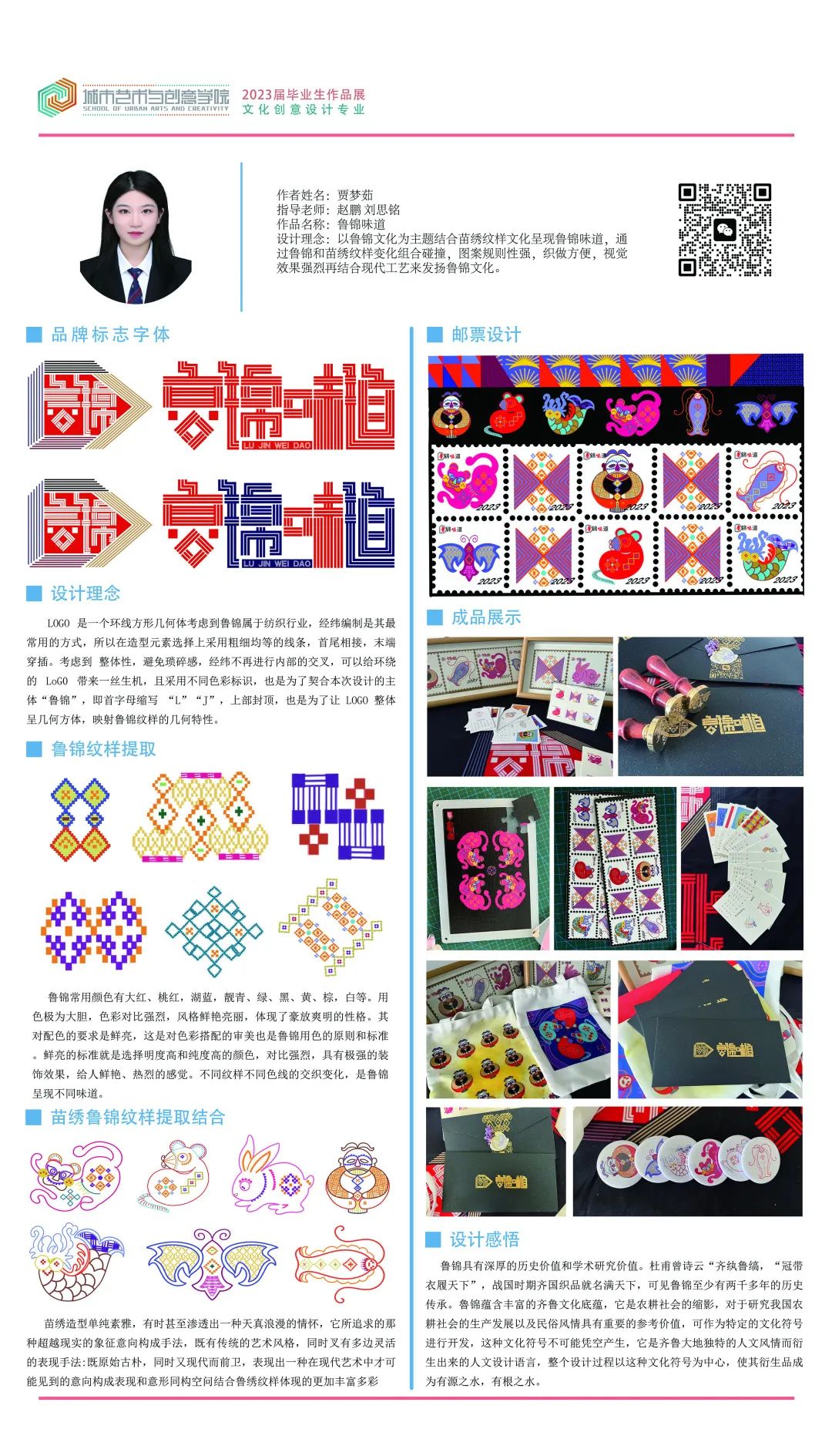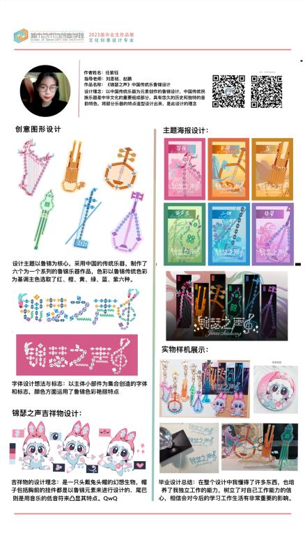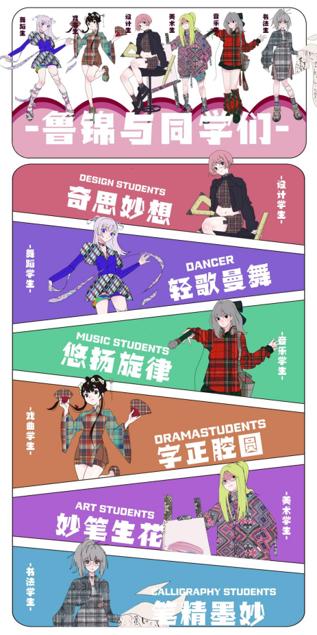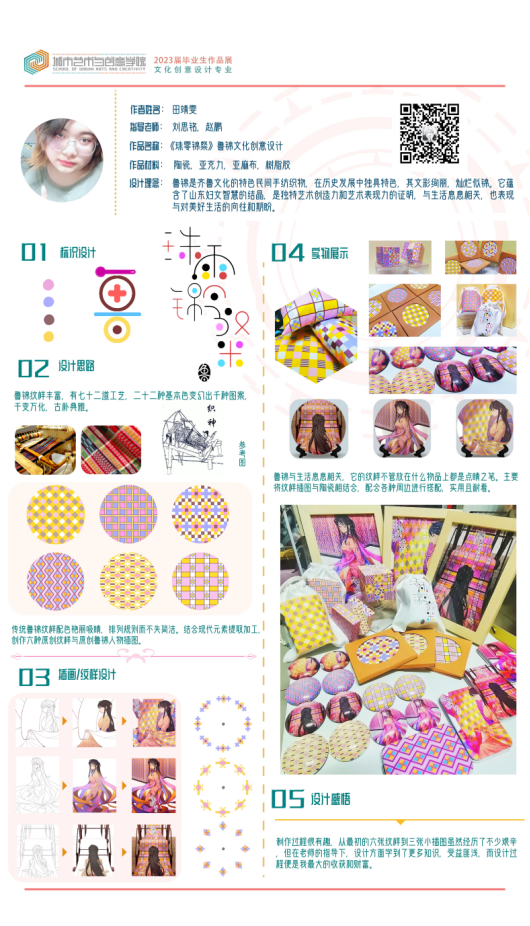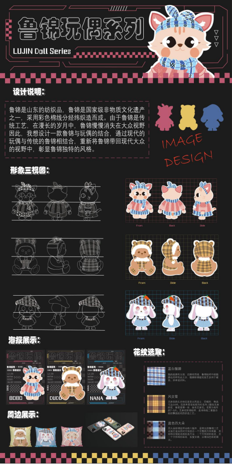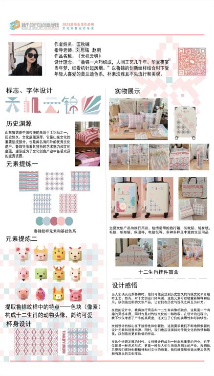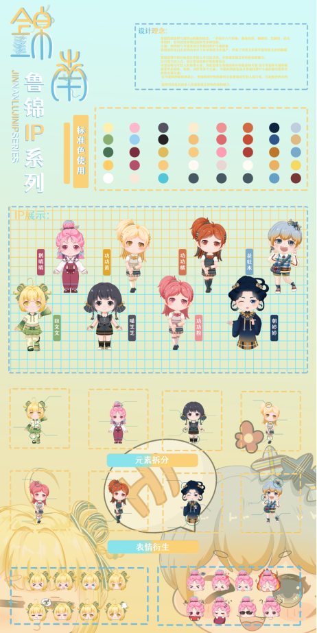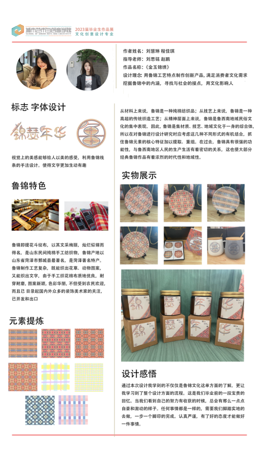 “锦”代表鲁锦,“南”代表山东省鲁西南是盛产鲁锦的地方。本次展览一共设计八个不同风格不同纹样的鲁锦小姑娘形象,结合现代时装及汉服元素,对鲁锦进行新的创新和再设计。时光如白驹过隙,2023年学期开始进行毕业创作,从开始定题鲁锦到我选题做鲁锦的卡通IP到大量的绘制草图确定角色再到形象的设计完成,如今看着这一个个鲜活灵动的小形象的诞生,才觉得这一切的努力都是值得的。我感恩我的老师对我三年的倾囊相授和孜孜不倦的教导,我感恩他们对我的严厉点评,更感谢20视传班的同学你追我赶才能让我们齐头并进地一起走到毕业,走完这满满的三年时光。这次毕设作品让我的大学时光画上了完美的一个句号,中间是太多的无法言说,是很多个夜晚挑灯奋战,是很多张废稿日积月累 ,我希望通过我的作品能够让观看者能从这些可爱的小形象里去认识鲁锦,能够去真正的传播和弘扬我们中国、我们山东省的优秀传统文化,让大家知道——原来老粗布一样的花样的布匹就是鲁锦,原来鲁锦就是山东的传统布匹。最后祝愿所有20视传的同学们前程似锦,我们毕业快乐,不说再见。