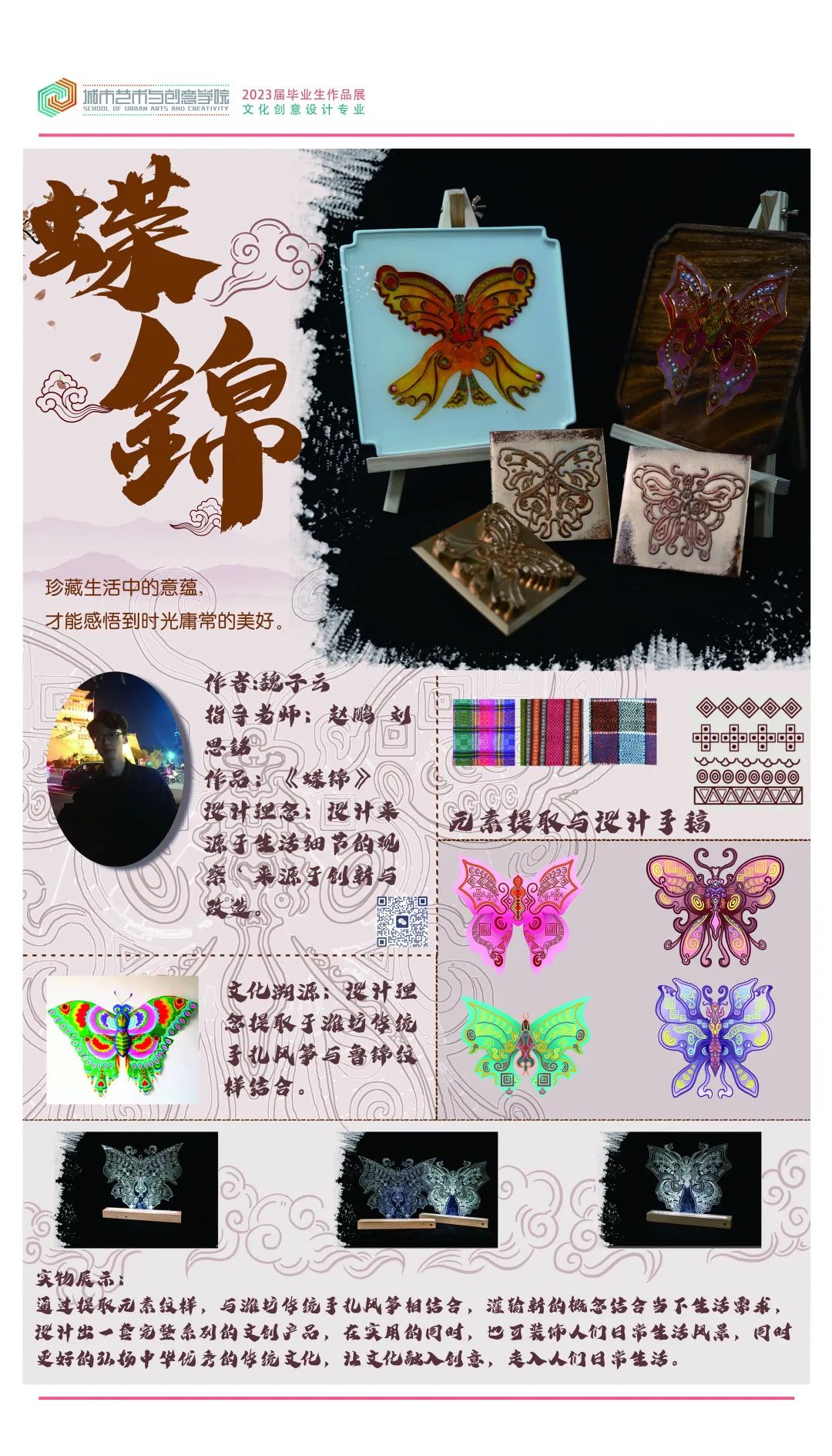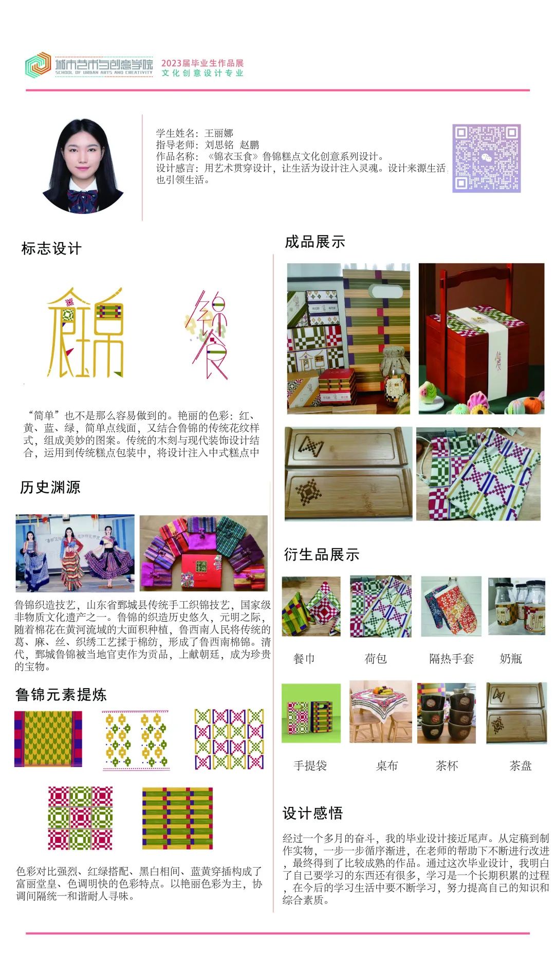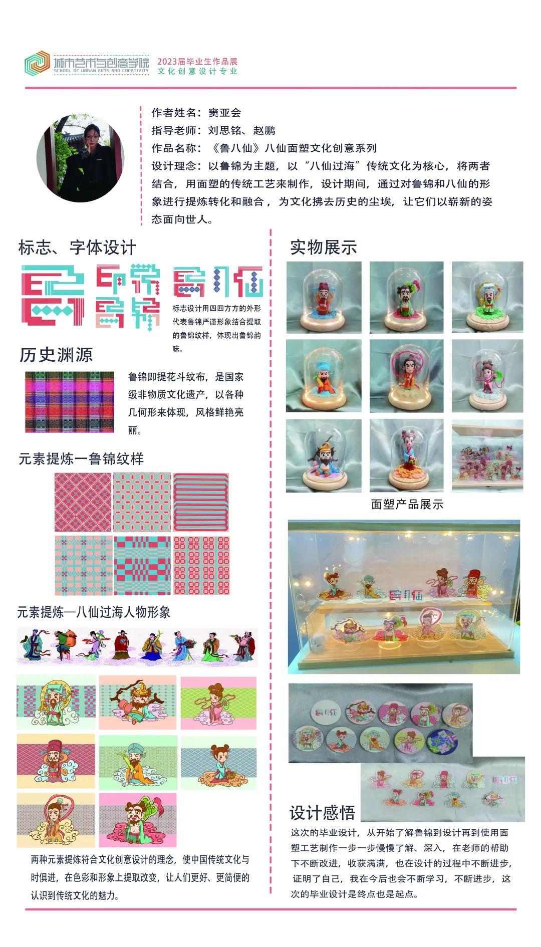 “锦”代表鲁锦,“南”代表山东省鲁西南是盛产鲁锦的地方。本次展览一共设计八个不同风格不同纹样的鲁锦小姑娘形象,结合现代时装及汉服元素,对鲁锦进行新的创新和再设计。时光如白驹过隙,2023年学期开始进行毕业创作,从开始定题鲁锦到我选题做鲁锦的卡通IP到大量的绘制草图确定角色再到形象的设计完成,如今看着这一个个鲜活灵动的小形象的诞生,才觉得这一切的努力都是值得的。我感恩我的老师对我三年的倾囊相授和孜孜不倦的教导,我感恩他们对我的严厉点评,更感谢20视传班的同学你追我赶才能让我们齐头并进地一起走到毕业,走完这满满的三年时光。这次毕设作品让我的大学时光画上了完美的一个句号,中间是太多的无法言说,是很多个夜晚挑灯奋战,是很多张废稿日积月累 ,我希望通过我的作品能够让观看者能从这些可爱的小形象里去认识鲁锦,能够去真正的传播和弘扬我们中国、我们山东省的优秀传统文化,让大家知道——原来老粗布一样的花样的布匹就是鲁锦,原来鲁锦就是山东的传统布匹。最后祝愿所有20视传的同学们前程似锦,我们毕业快乐,不说再见。