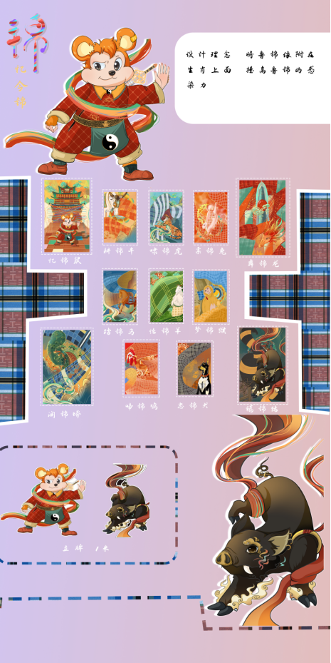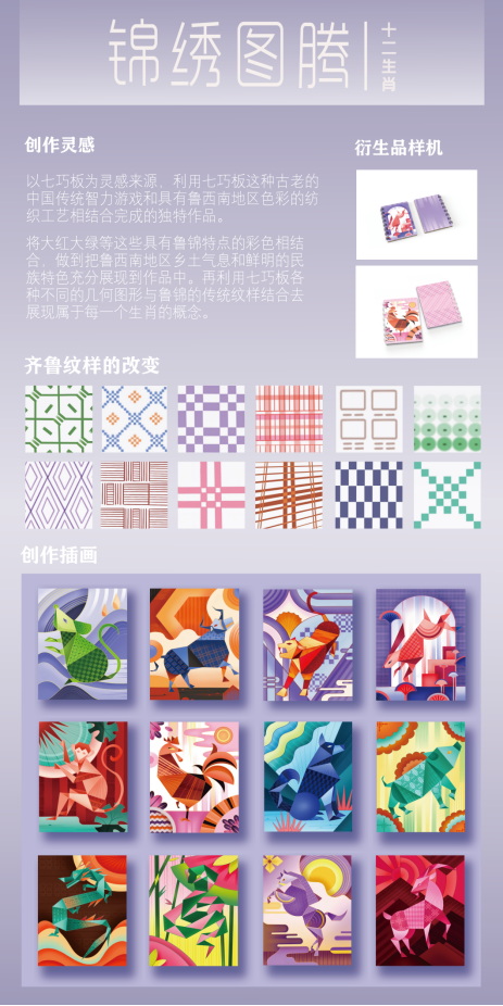 《鲁锦图腾》以七巧板为灵感来源,利用不同的几何图形和鲁锦有趣的纹样去灵巧的展现这十二个生肖不同的形象特点。使用了大红大绿等高饱和度的颜色,展现纺织鲁锦的百姓们爽朗正直的性格特征,也将鲁锦的魅力以此种形式传给大家,使鲁锦这一传统织造技艺让更多人认识。