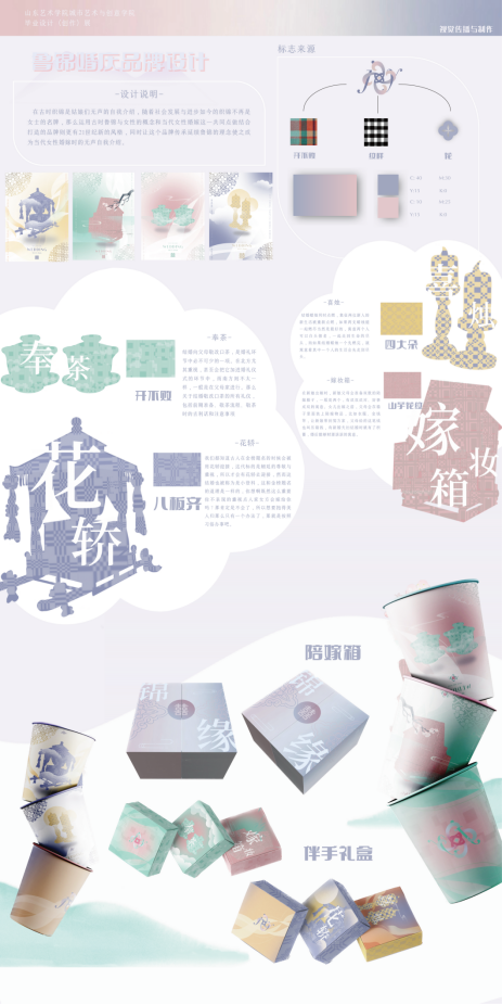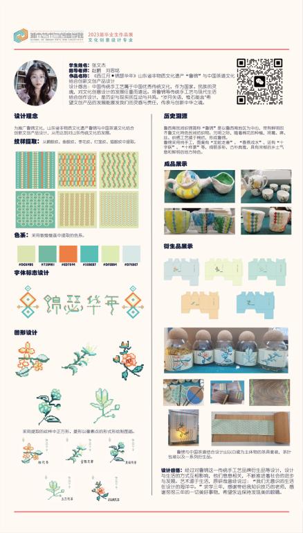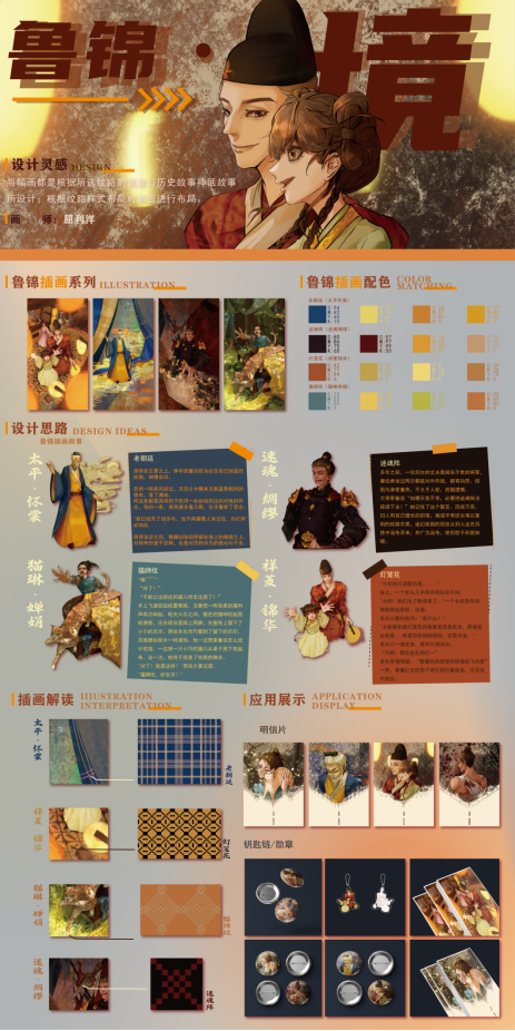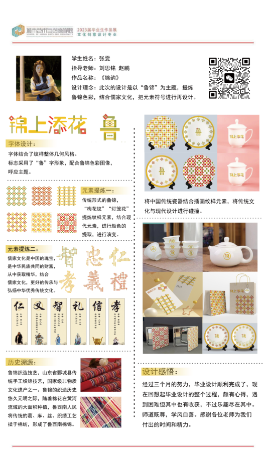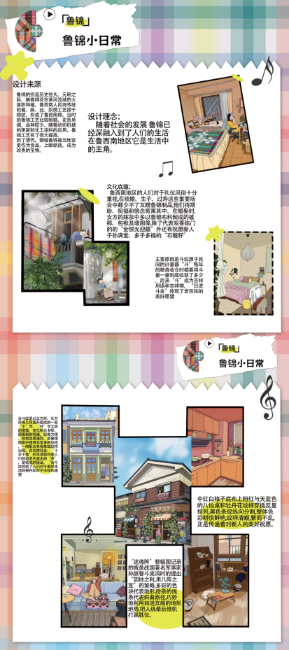 本作品以“鲁锦”为主题,提炼鲁锦色彩、纹样,结合“鲁家”文化,提炼文化符号并将其设计打造文创产品。