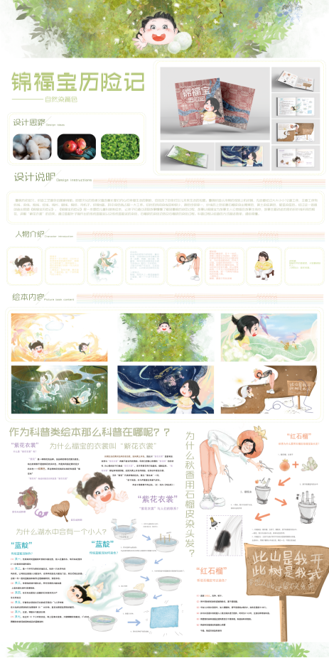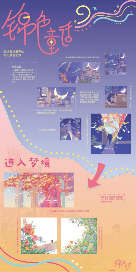 鲁锦作为我国的传统技艺已经慢慢的淡出人们的视野,于是我决定赋予他们新的“生命”,让鲁锦幻化成精灵,让它们自己去寻找孩子们,让孩子们发现鲁锦的美,踏入“鲁锦仙境”感受鲁锦绚丽奇幻的色彩,体验千变万化,纵横交织的丝线,主人公选择的是一位小女孩,讲述的是小女孩从遇到鲁锦精灵到进入鲁锦仙境打败劣质染色怪物,最后在美梦中醒来躺在鲁锦做的床品上的故事,前后运用了两种不一样的色彩效果以突出鲁锦的绚烂。