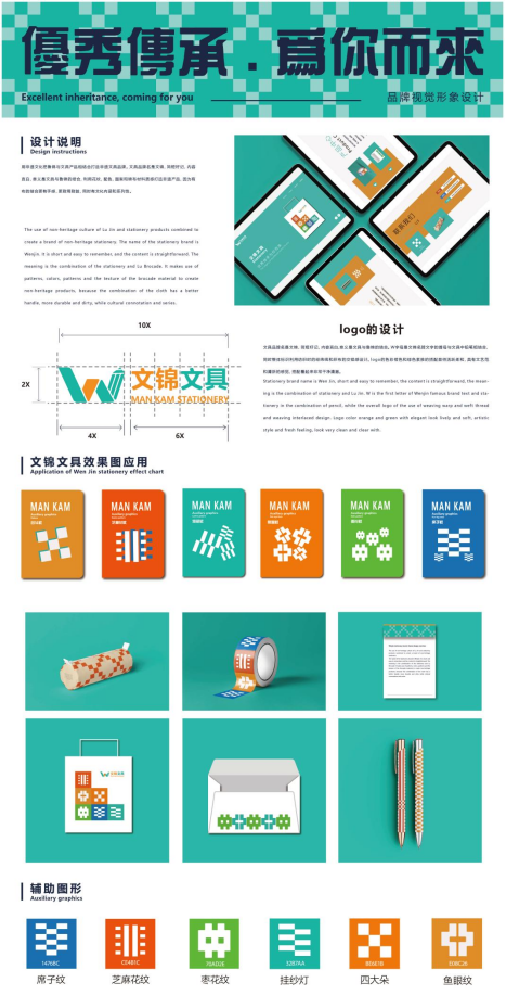 文具品牌名是文锦,简短好记,内容直白,意义是文具与鲁锦的结合,利用花纹,配色,图案和锦布材料质感打造非遗产品,因为有布的结合更有手感,更耐用耐脏,同时有文化内涵和系列性。