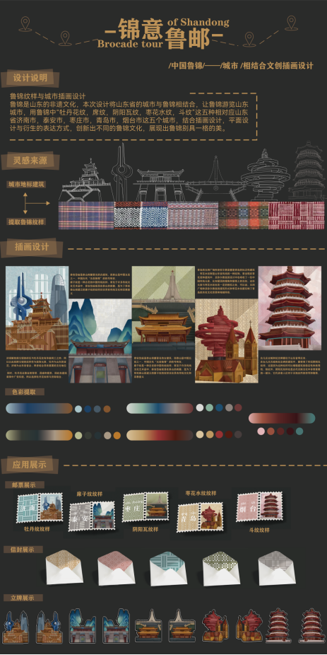 作品主要用鲁锦和城市作为表达点,把鲁锦特有的纹样与城市标志性建筑相融合,使用鲁锦纹样为城市建筑雕梁画栋。展览中采用了邮票卡册互动的方式,让更多的人了解鲁锦的魅力,把鲁锦运用到生活中,也是为了促进鲁锦非遗文化推广到各地。