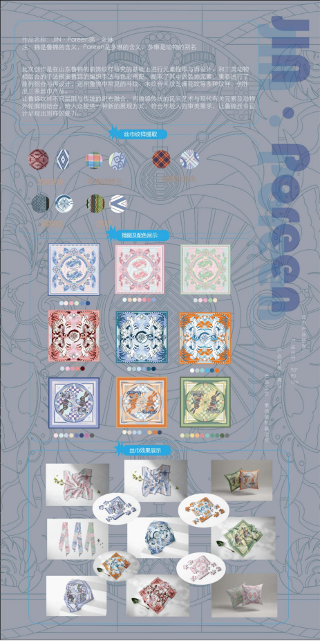 此次创作是在山东鲁锦的装饰纹样研究的基础上进行元素提取与再设计。通过和三类动物相结合的手法,根据鲁锦的编织手法与色彩搭配,提取了其中的装饰元素,重新进行了组合与再设计,运用鲁锦中常见的斗纹、水纹、合斗纹、芝麻花纹等多种纹样,创作出三条丝巾产品。