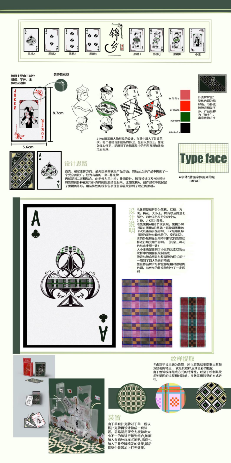 作品以扑克牌的形式展现,以装置以及产品的方式来表现鲁锦。体现鲁锦工艺的魅力,将鲁锦独特的魅力通过产品的特点表达出来,通过这一套弘扬鲁锦文化的作品,以鲁锦花纹为元素,将鲁锦传统的美感压缩在产品之中,将产品赋予一种耐人寻味的特性。后会以系列产品为媒介,大力弘扬鲁锦工艺,传统的工艺是优秀的,而优秀的东西是值得传承的。