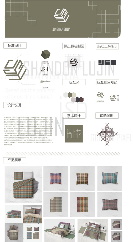 对于鲁锦来说,已沉淀太长时间、太多历史的它充满了岁月漫长的历史性。鲁锦的老粗布让无数人度过了数不清的寒冬与苦暑,它对于山东有着不可言喻的感情。同时岁月也逐渐埋没了它,让人们遗忘了鲁锦。时间流逝的太快,时代也进步的太快,传统仿佛变得苍白无力,人们好像不记得它了,鲁锦也显得无力且疲乏。我在做鲁锦的时候,第一个感触就是它好像在呼喊、在求救,想让人们不要忘记了它,再次用起它。传统文化不应该随着时代而变得逐渐透明、被割舍;在制作品牌的过程中我们考虑到了鲁锦的俗气,我们并没有贬低这份俗,反而更应该在这反复而有意思的图文中感悟历史的美妙。我们为它起了一个接地气的名字:“锦上花”,让他更贴近鲁锦本身。我们的构想是把锦上花这一俗气的品牌赋予高级感,从而把鲁锦高度再加以抬高。打造国际品牌的亮度,让人们认识鲁锦、了解鲁锦,更多人去熟知鲁锦。我们“锦上花”鲁锦的设计观和其他产品设计不一样,和其名字一样,我们没有再继续现在流行的所谓浮夸空虚的设计观念。而是去强调设计与自然之间的关系。