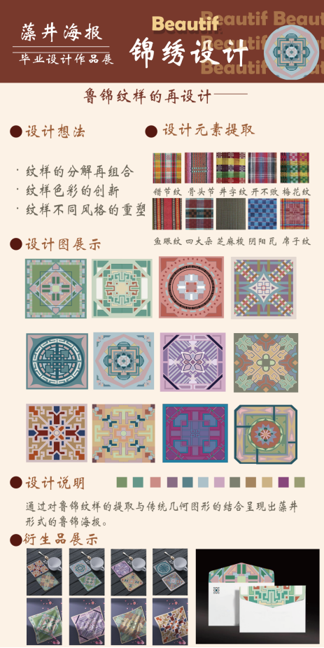 毕业设计的内容是将非遗文化齐鲁地区的锦棉与现代产品文具内容进行结合创新,继续发扬非遗,为鲁锦开发新的道路和新的市场,对鲁锦中的花纹进行提取,保留它的花纹和寓意,进行创新结合文具产品发展新的鲁锦文化。