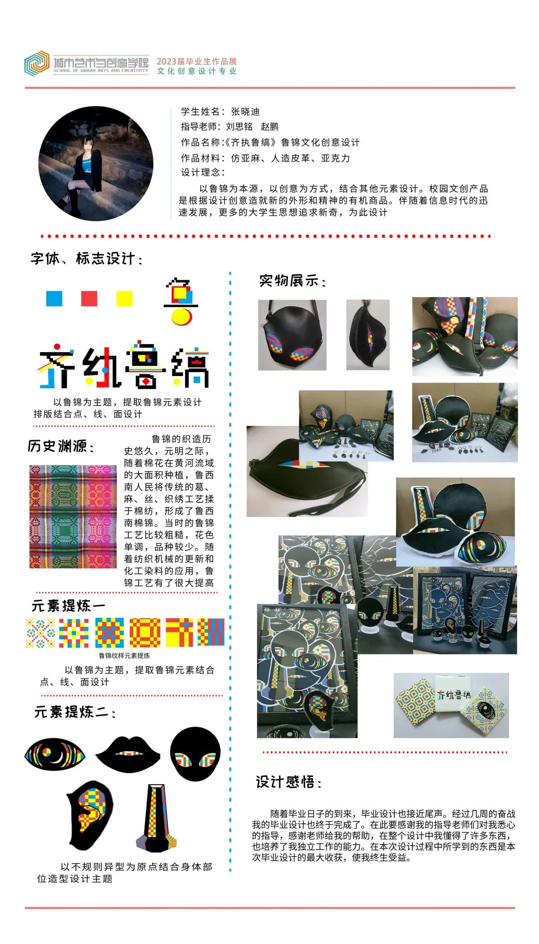 随着毕业的日子到来,毕设也接近尾声。这段日子真是感慨万千。当确定毕设的主题是鲁锦,我们便开始搜集了大量的资料,老师也是非常耐心的引导我们如何选择毕设的主题方向,和我们共同探讨,真的非常感谢我的老师对我的悉心指导,也非常感谢给我帮助的同学们,在毕设里增进了同学之间的关系,我们一起互相帮助,互相商量,这将成为我人生中最珍贵的回忆。我做毕设时遇到问题老师总会给我解答,老师无论多晚都会回复我的信息,我记得唐老师有一次都凌晨四点多了还回复我的信息。在老师的身上不仅学到了扎实、宽广的专业知识,也学到了做人的道理。告诉我们一定要认真坚持,保持对设计的热爱,和好学的心。在做书籍的过程中不仅学到了很多知识,也遇到了很多艰辛,和工厂的对接,打印书籍为了能做完美,好几次和朋友去工厂对接,真的很感谢她能陪我。也很感谢老师一遍一遍地和我交流如何选择纸张、如何呈现当时的设计方案,最后经过小小的修改终于做出来了。布完展真的很有成就感。漫长而又短暂的老员工涯即将结束,这将是我匆匆时光里值得记忆与回味的、最难忘的回忆。