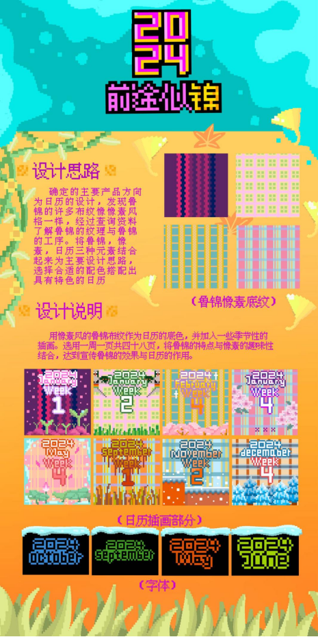 以鲁锦为主要主题,加入像素元素,以日历作为载体进行表达及推广,通过上网以及查询相关书籍找到的鲁锦布纹与配色为底,以一周为一页共四十八页,加入像素风格的字体与季节性的插画。兼顾发扬传统以及创新设计,在两者之间寻求一个更加平衡的点。