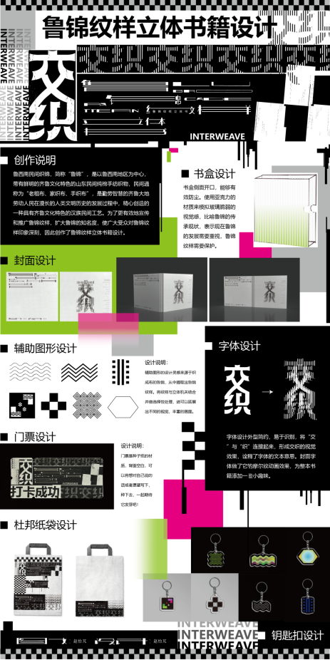 鲁西南民间织锦,简称“鲁锦”,是以鲁西南地区为中心、带有鲜明齐鲁文化特色的山东民间纯棉手纺织物,民间通称为“老粗布、家织布、手织布”,是勤劳智慧的齐鲁大地劳动人民在漫长的人类文明历史的发展过程中,精心创造的一种具有齐鲁文化特色的汉族民间工艺。为了更有效地宣传和推广鲁锦纹样,扩大鲁锦的知名度,使广大受众对鲁锦纹样印象深刻,因此创作了鲁锦纹样立体书籍设计。