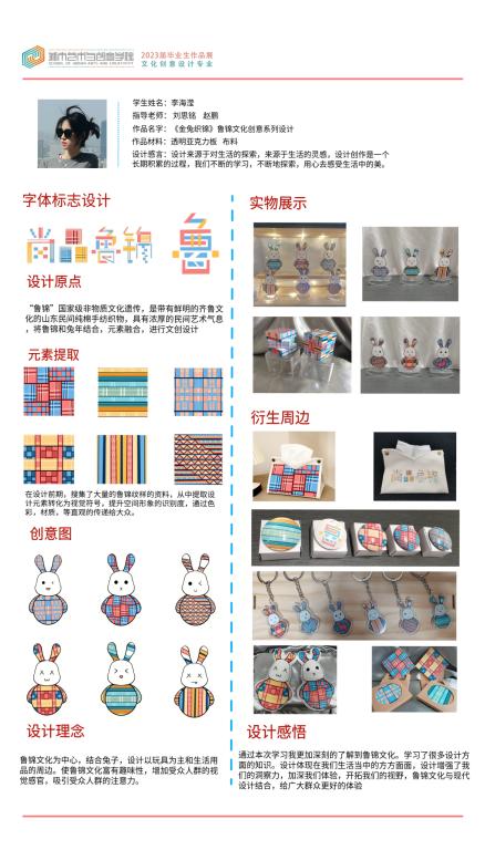 以鲁锦文化为核心,结合生肖兔的创意造型。设计以玩具为主的生活用品和周边。使鲁锦文化具有趣味性,增强受众的视觉感官和使用效果。