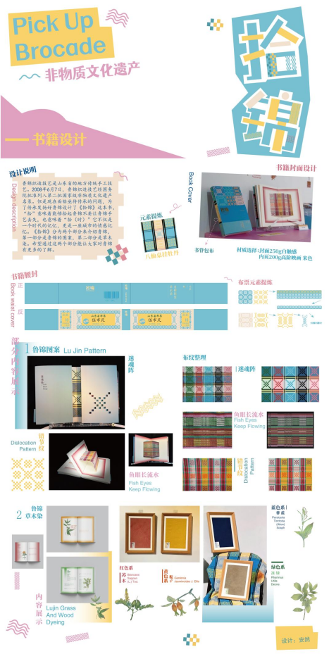 为期半个学期的毕业设计即将结束,在这段时间里受益匪浅。从一开始选题思路的纠结,经过老师各种建议,也很清晰地确定了选材主题,通过书介绍宣传鲁锦。从收集各种资料整理,到书籍排版,经过各种修改,再到实物制作,一步步看到收获成果。这一路走来,有点辛苦,但通过离校前的最后一件大事,毕设完美收尾,感觉成长了许多,也许这就是真正的生活。最后还要感谢我的指导老师唐老师和任课老师,感谢你们的悉心的指导,感谢老师给我的帮助。