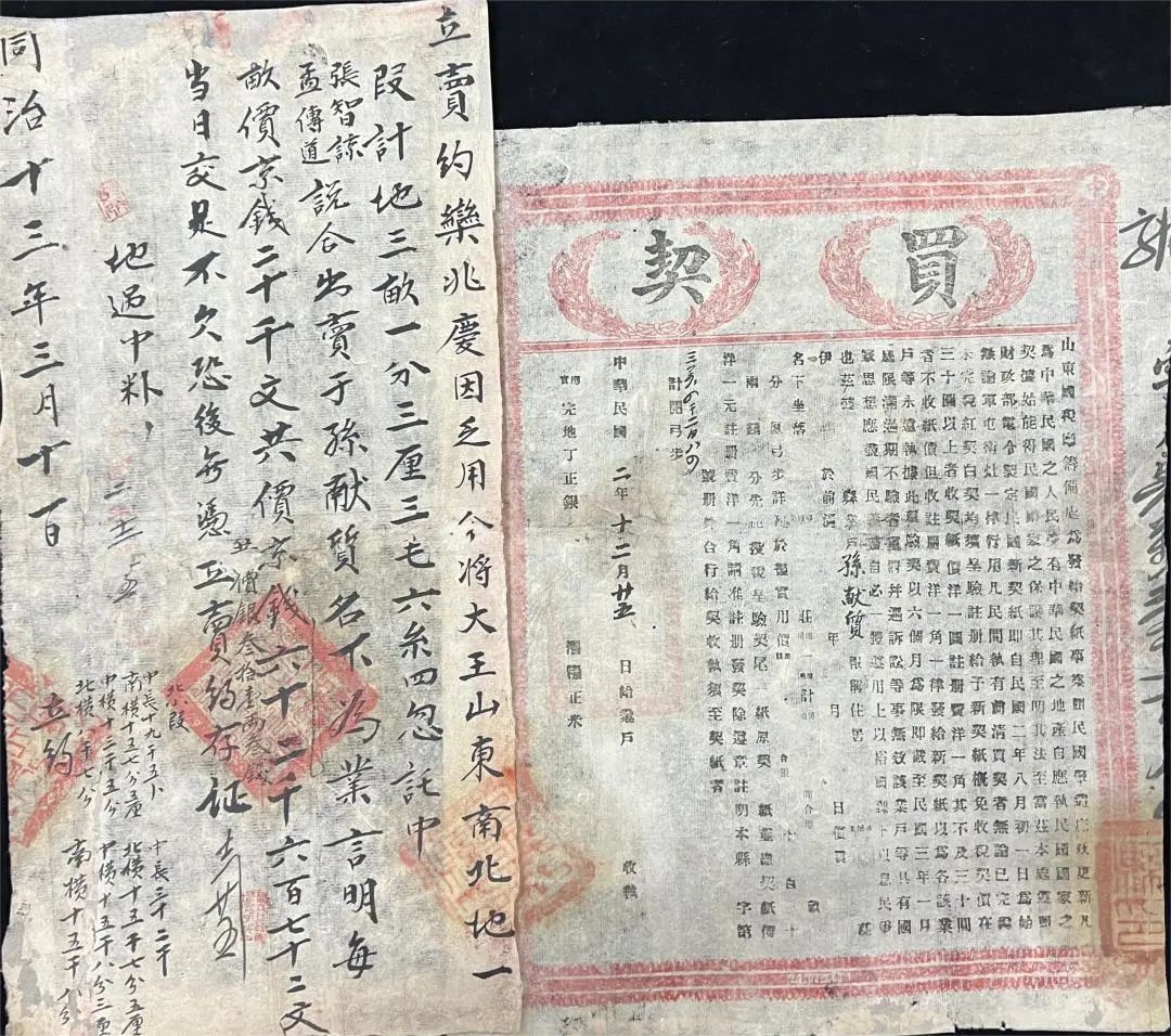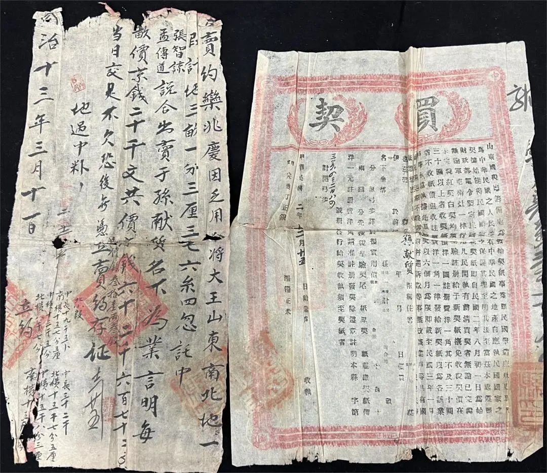 该契为同治十三年地契、民国二年买契二联地契。由契文可知,民国二年买契是同治十三年地契呈验注册后的新契纸,因政策原因前清地契免收契税,所以并无第三联契税联,是完整的二联地契。该契因年久,粘连处浆糊失效,使得二联分离根据这个情况,采用了拆分的修复方式修复。对两张地契分别进行泅色测试后发现两张地契的印章均有泅色情况,为此,对比了各种固色方式的优缺点后选择了减少用水量、用宣纸遮盖泅色处隔离水分、泅色处沾水后及时撤水的方式防止泅色。补纸选择了古籍修复用的仿古色混料皮纸,该纸的颜色、性能与该契接近,无帘纹,但是相较该契纸张过于单薄,因此将两张仿古色混料皮纸进行了托裱,以此加厚厚度。在补缺时,严格控制水分,能伸展开褶皱即可。
