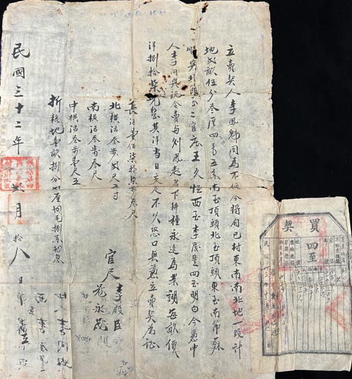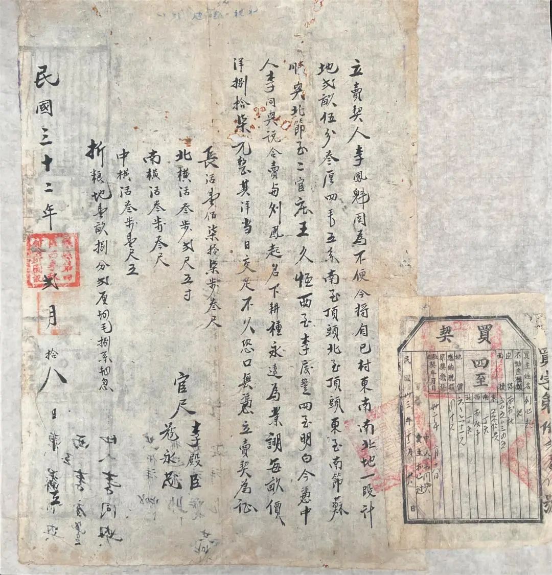 该契为道光二十一年地契。地契分为“红契”、“白契”。有官府铃印的为红契,无官府铃印的为 白契。此为白契,是买卖地契人双方之间的私下交易,未经过官府认可。从契文“日后钱到日赎”上可看出卖地人的窘迫,未经过官府是为了躲避契税。该契用纸非常薄,其薄厚度、颜色、性能与古籍修复用仿古色混料皮纸接近,无需染色。因纸张性能整体较差、多处接近断裂,且过于单薄,加上后期需要装裱成镜框的原因,所以选择了使用生宣进行托裱。相较于书画修复在托裱过后需加折条,该地契在修裱后并不需要加折条。因为地契的纸张薄,一般而言使用三桠皮纸已经足够牢固,而此次使用了生宣作为命纸,强度更高,而且后期采用镜框的方式装裱,不需要收卷,不会造成新的断裂。修复后上墙绷平、方裁入框,至此该地契修复完毕。