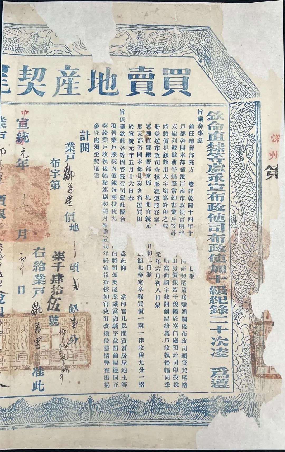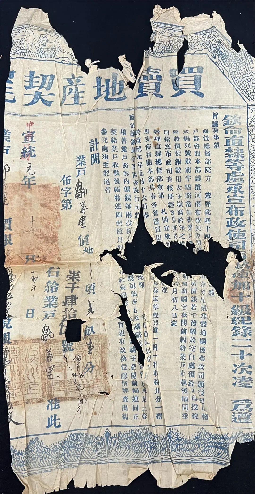 此地契为宣统元年十一月初十日买卖地产契,因其带有龙纹,又被称为“龙契”。“宣统元年处盖有“中华民国”戳记,推测该契为残契,在民国时期统一制度的新契纸缺失。根据契文“铃印之处《缺失),明当面骑字截开前幅给业户收执,后幅同季册汇送布政司查核”可推断,该契纸存在另外一半契纸,因被截开导致该契的形状为近似长方形的不规则四边形,其作用在于防伪、验证为了保持原有的防伪作用,在修复时并未将此契补齐为长方形,而是保持其不规则的状态,该地契的主要修复难点在于破损处面积较大、褶皱较多,且纸张存在变形情况。因为破损面积大,所以需要慎重选择补纸。该契纸的纸张为深黄色宣纸,在选择补纸时采用了于该契纸颜色相近、薄厚相近、材质相近的纸张,补纸的原色与契纸相近,因此并未选操染纸。在测试了印章、文字的润色后确定该契纸无酒色情况后,为了满足展览装镜框的需求,选择了托袜的方式修复。在修复时,先从最中间的缺失开始修复,先喷少量的水,使契纸保持在一种微潮的状态下展开纸张皱褶处。地契的用纸相较于书画用纸更薄,在有皱褶的情况下使用过多的水会加大其修复难度,但如果水量大少,皱裙伸展后又会重新缩回,因此水分的控制在地契的修复过程中非常重要。该契纸在伸展过程中出现了伸展不开的情况,这是由于该地契在印刷过程中因为印刷的压力产生的变形的情况。因此在修复过程中不能太湿,防止其过度伸展,无法伸展开的地方保持原样,不要过多拉扯导致整张地契变形。修复好后托裱、上墙绷平,干后方裁、入框。