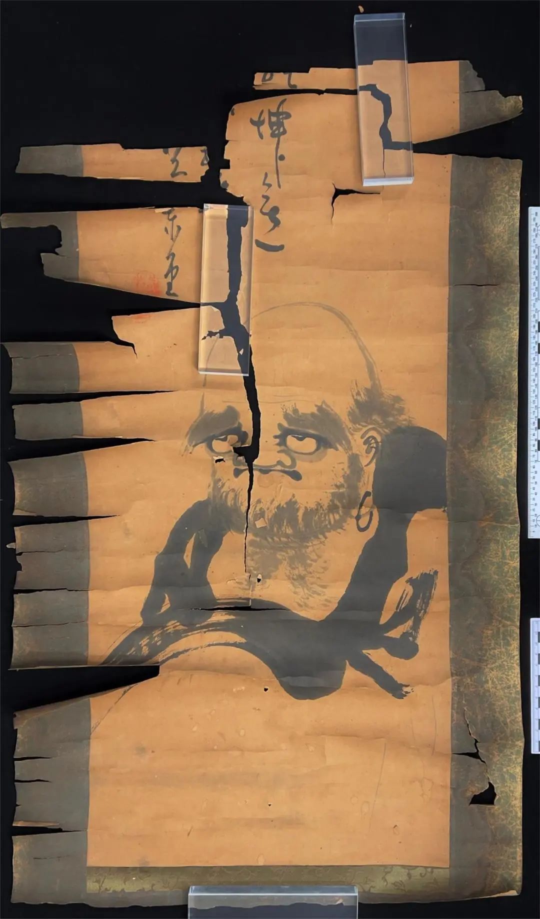 该件作品为纸本水墨书画文物修复。修复前存在的主要病害类型为残缺、断裂、褶皱、污渍等,其中残缺病害最为严重。作品原装裱形制为立轴,天头地脚缺失,画心仅存下半部分,上半部分残缺严重并伤及落款,导致文字无法完全还原。整体病害呈现不断发展的趋势,急需抢救性保护修复。根据病害类型及文物基本情况,制定出以下修复方案:对残存画心进行整体清洗,降低纸张酸化程度;依次揭裱原裱件的覆背纸、命纸,保留揭裱下来的命纸;古纸补破,将上半段残缺部分接出一段空间;对画作内容显著性残缺断裂处进行小范围全色接笔,使画意完整。
