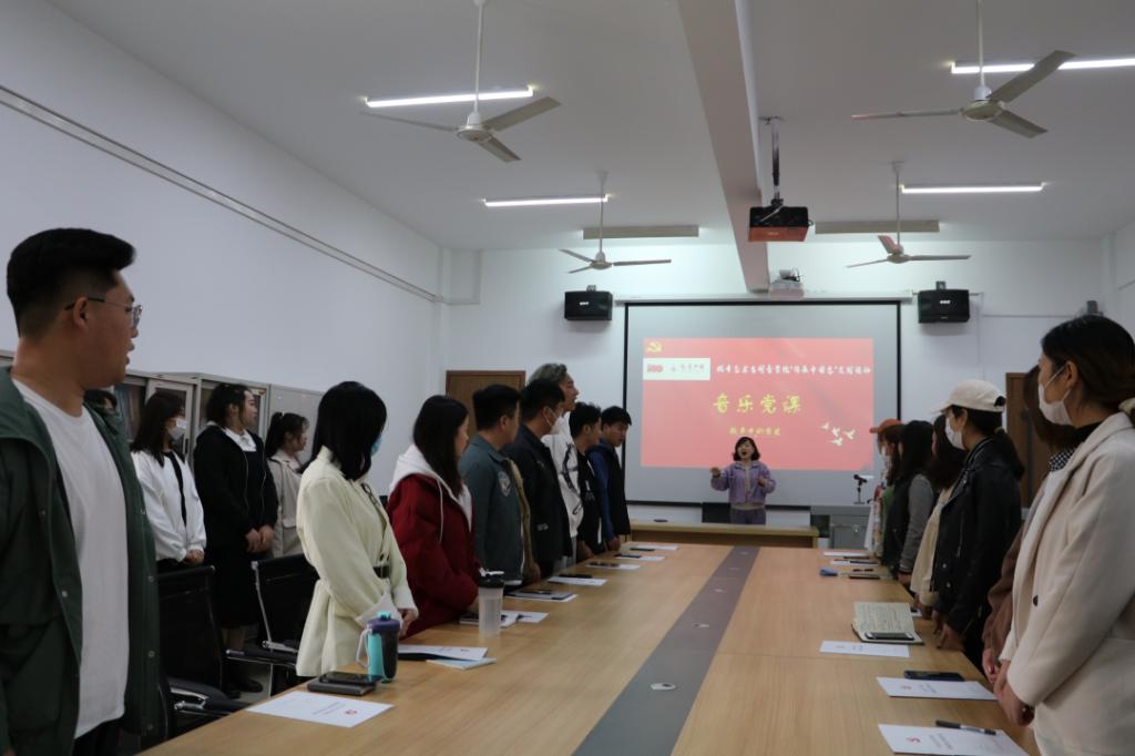 党课内容以史串歌,以歌叙史,为我们展现了中国共产党波澜壮阔的光辉历程和伟大成就。每一首歌曲都入脑入心,感人至深。” 大家跟着董书记的节奏慢慢融入,不一会会议室便充满了激情高昂的歌声,音乐启迪心灵,音乐陶冶情操,我们在音乐中以史铭志,不忘初心。
