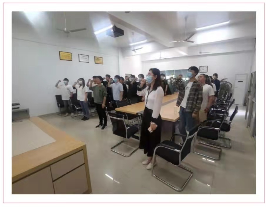 大家在团总支老师的带领下集体高举右手、紧握右拳,庄严宣誓。宣誓声在会议室内回荡,大家坚定的目光和铮铮的誓言展现出共青团员积极向上的活力和朝气。