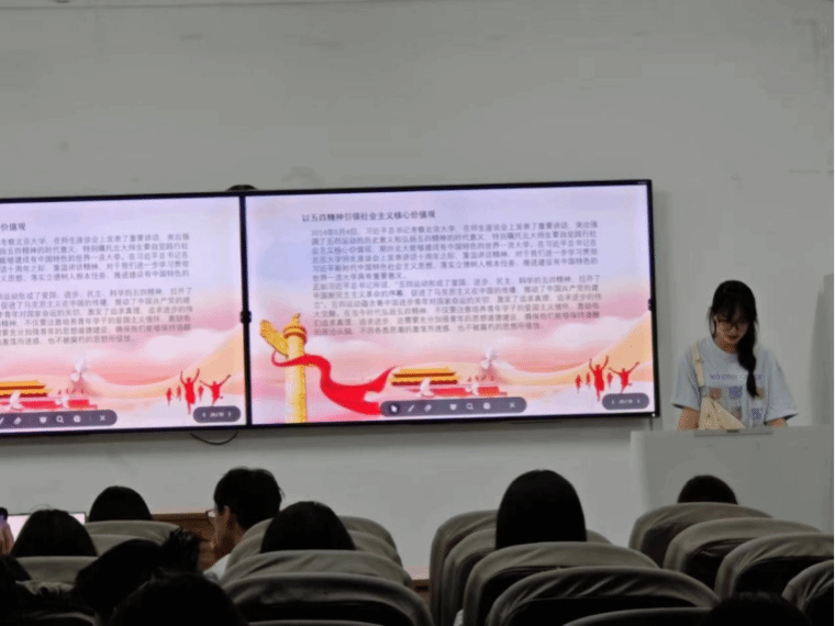 活动伊始,主讲人向同学们详细介绍了五四青年节的历史和核心价值,阐释并学习了五四精神的深远意义。通过学习习近平总书记对新时代青年的殷切寄语,同学们被总书记对青年一代的深情厚望所感动,并且深刻理解了新时代青年的责任和使命。