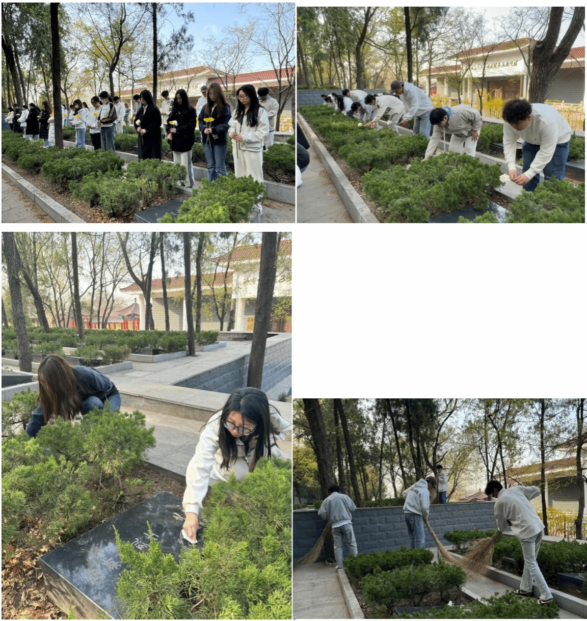 苍松翠柏掩映下的烈士陵园庄严肃穆,巍然矗立的革命烈士纪念碑镌刻着永不褪色的英雄史诗。团员青年们手持白菊列队肃立,向为民族独立、人民解放事业英勇献身的革命先烈们鞠躬默哀。墓碑前,青年学子俯身轻放菊花,以无声的敬意追思先烈们的丰功伟绩。一朵朵洁白的花瓣,承载着后辈对英雄的深切缅怀,更凝聚着新时代青年赓续红色血脉的坚定信念。随后,志愿者们仔细擦洗每一座烈士的墓碑,清理周围的杂草,以此表达对革命先烈的无限哀思和敬仰之情。经过大家的共同努力,墓碑变得更加闪亮、道路更加干净、环境更加整洁,烈士陵园整体变得更加庄严和肃穆。