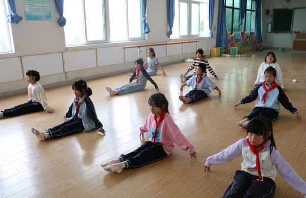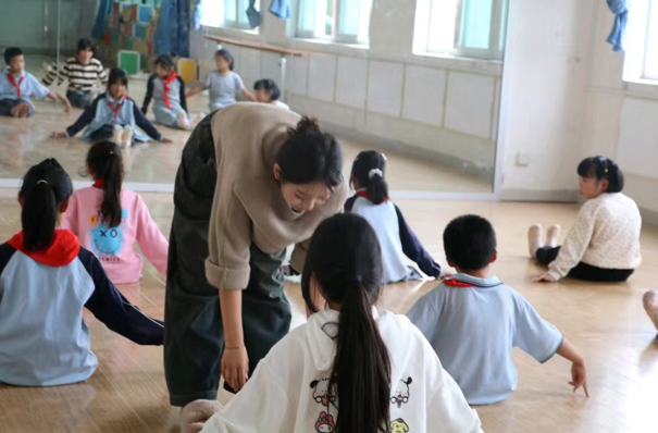“哒哒哒哒”舞蹈鞋砸在地板上,发出清脆的声音。舞蹈教室的同学们很珍惜这一次的学习机会,他们认真听着老师的教导,尽可能地立起身板,跟着老师的动作摆出舞姿。他们绷直的脚背与展开的手指都在展示着舞蹈的优美。志愿者老师弯下腰,为同学摆正姿势,同学们稚嫩的脸庞上洋溢起天真的笑容。