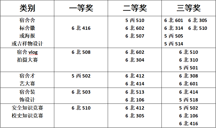 本次宿舍文化节将从五个方面进行展开,分别是:宿舍舍标舍徽/海报/吉祥物设计、宿舍装饰设计、宿舍才艺大赛、宿舍vlog拍摄和知识竞赛答题。