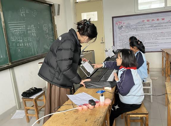 声乐课上,小朋友们认真的听着志愿者老师对于唱歌技巧的讲述。他们在老师的带领下放声歌唱,稚嫩的歌声回荡在了校园的每一个角落。