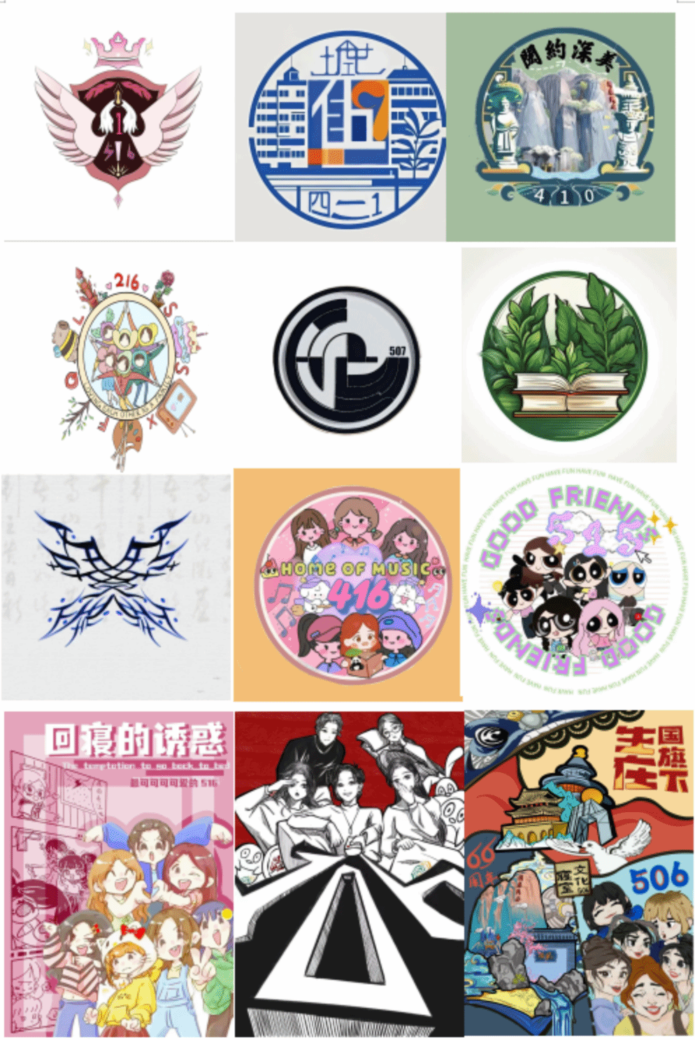 宿舍舍标舍徽/海报/吉祥物设计环节,各宿舍成员发挥专业特长和创意思维,设计出既体现公司特色又彰显宿舍个性的舍标舍徽、海报和吉祥物,这些作品不仅增强了宿舍的凝聚力,也提升了同学们的艺术设计和团队合作能力。