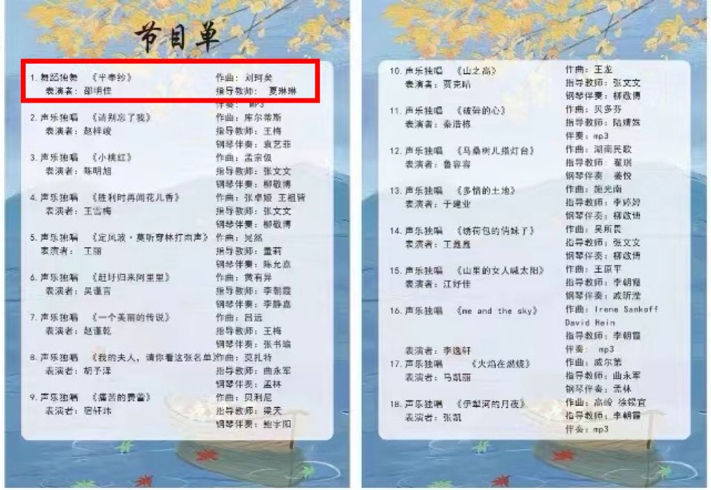 在上一学期同学们掌握的各种舞蹈技巧的基础上,本学期加入了一些新的技巧训练,如:步态练习、柔韧练习等。在掌握这些基本技巧的基础上,逐渐进入单一动作、组合的训练。并且,结合舞蹈剧目,掌握常用舞蹈道具的使用,进而提高舞蹈表现力。