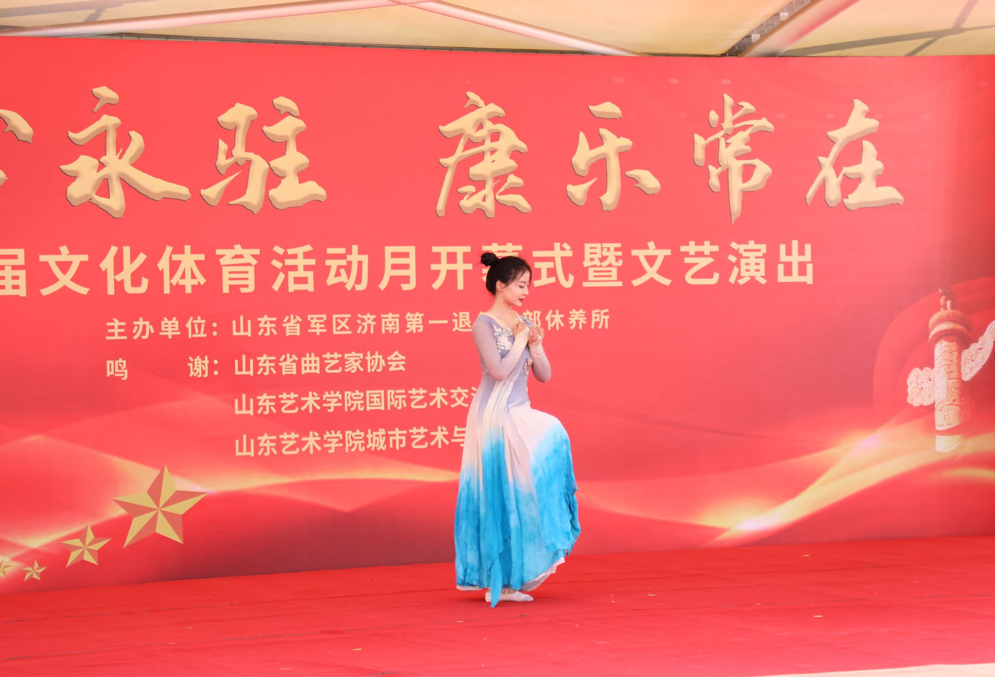 形体课不仅培养了同学们的高雅的体态、优美的气质以及保持好的身段。同学们还利用课上学习到的舞蹈积极参与社会实践。2024年6月,优秀员工在济南市参与第二届“初心永驻,康乐常在”文化体育活动月开幕式暨文艺演出。