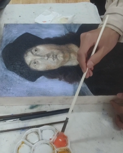 通过对油画材料的分析研究,同学们对画布、颜料、绘画工具和溶剂等有了深刻理解,能够准确识别和使用这些材料。在学习不同时期的油画技法过程中,同学们不仅掌握了多种绘画技法,还能够模仿不同时期的绘画风格,探索不同的创作方式。这为他们在实际修复工作中提供了丰富的技法储备。在油画创作阶段,同学们将所学知识与文物保护理念结合,创作出独特的作品。这不仅锻炼了他们的创意思维,也提高了他们的综合创作能力。