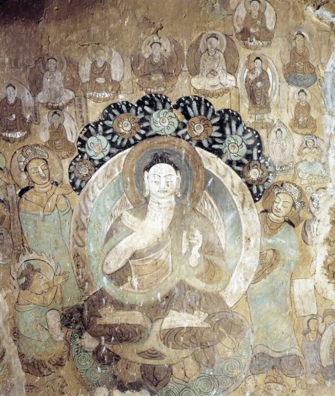 炳灵寺169窟是一个集中反映西秦佛教艺术的自然大窟,窟内壁画虽已经历了1600余年的历史沧桑,但仍保持着鲜艳如初的色泽。其中最引人注目的是绘于北壁的一幅较大型的佛说法图。画面上的佛结跏跌坐于俯莲座上,双手曲臂上扬作说法状,头光及背光外有象征形的菩提树枝叶,俯莲台下绘圈状翻转的水波。佛两侧绘二菩萨拱手向佛侧立,右菩萨后上方又绘两身袒上身的飞天,手持供物,飘带飞扬,身躯呈“U”型迎佛飞舞。这种飞天造型与莫高窟石窟呈“V”字型的早期飞天极其相似,反映了佛教艺术在地域上的传承与发扬。尤为有趣的是,佛座前还绘一位高鼻深目、黄头发的西域胡人,单膝跪拜举目向佛,神情虔诚生动,具有一种浓厚的异国情调。整幅画面以简洁的造型和粗犷的笔触,描绘了佛法的庄严神圣和不同人物微妙细腻的神情姿态,给人留下广阔的想象空间。绘画以我国传统的线描法用墨线勾勒而成,线条奔放,挥洒自如,但在人物的双眉、鼻梁及眼部则用白色施以西域式的晕染,以强烈的明暗对比来增强立体感的效果。