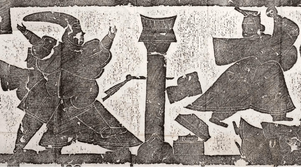 《荆轲刺秦王图》中荆轲在左,秦王在右,荆轲刺秦王的时候,第一下划掉了秦王的袖子,秦王右手高举展示的是他想要向后拔剑的时刻,生动刻画了荆轲刺秦王时的连续的过程。