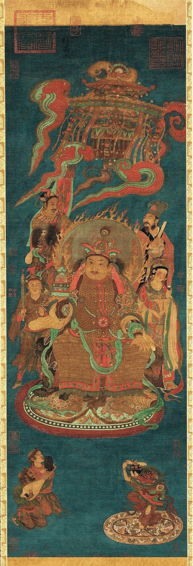 《天王图》介绍:从历史记载中我们可以看出,尉迟乙僧的绘画与当时中原绘画风格有着明显的区别,他的绘画题材内容非常广泛,但都打上了深深的民族烙印。《唐代名画录》评其画:“凡画功德、人物、花鸟,皆是外国之物象,非中华之威仪。”“景玄尝以阎画外国之人,未尽奇妙,尉迟画中华之像抑亦未闻。由是评之,所攻各异,其画故居神品也”。吐火罗画家笔下的人物必然带有其自身民族形象的特征。克林凯特在《丝绸古道上的文化》中提到:“在库车附近的克孜尔洞窟内出现在我们面前的吐火罗供养人是高大的白皮肤人物,有一部分是蓝眼睛红头发更具欧洲人特点。”正如我们在克孜尔壁画中所看到的,其人物形象俨然与中原人物迥异。可以想象,尉迟乙僧所画的“皆是外国之物象”正是自然而然地反映了他本民族的相貌气质。尉迟乙僧的创作题材涉及功德、人物、鬼神、菩萨、佛像、花鸟,以及龙兽。尽管种类颇多,但首先,所有作品中最为震撼人心的不是佛像或花鸟,而是千奇百怪的鬼神和造型奇异的菩萨。彦悰《后画录》谓其:“善攻鬼神……外国鬼神,奇形异貌。