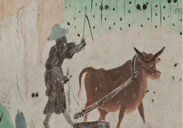 陕西石刻壁画《牛耕图》解析:农夫与牛,“牛的形态”趋于平面化的色块剪影,色彩的运用提升壁画的层次感和空间感,这种色彩上的差异体现出壁画内容的完整性,色彩的区分和线条的组合传递着故事的氛围。通过色彩明暗强度,对牛面部特征进行了细致的描绘,牛身的姿态与动势强调出牛肌肉的发达以及姿态的矫健。“牛耕图”的在陕西壁画中出现,就是植根于我国数干年农耕文明的丰厚沃土,牛与中华先民历代社会生活、信仰崇拜密切相关。它是物质创造和艺术活动的客观记述,也是游牧与农耕文化交融的见证。陕西壁画中充分描绘了民众的日常,具有与世俗绘画不同的审美特征和艺术风格,源于生活,高于生活。