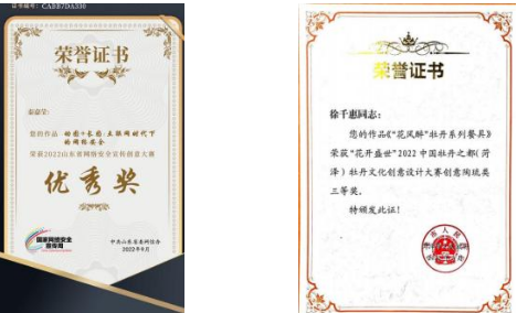 46. | 2022.9 | “花开盛世”2022 中国牡丹之都(菏泽)牡丹文化创意设计大赛 三等奖 | 厅局级 |