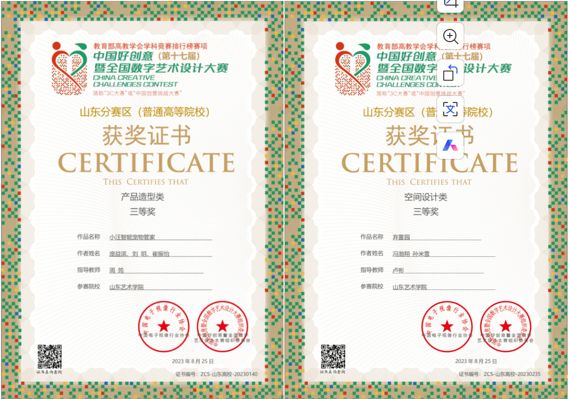 2. | 2025.7 | 第二十届好创意暨全国数字艺术设计大赛山东赛区优秀奖 | 省部级 |